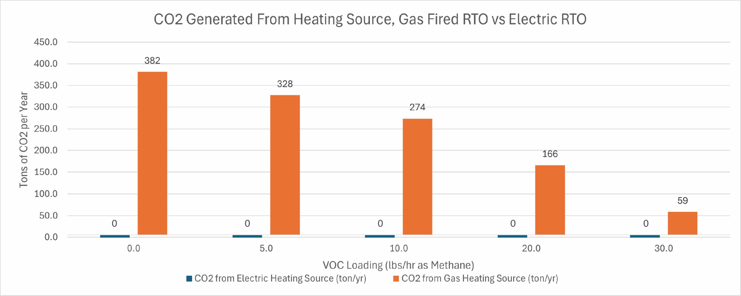 This only considers the CO2 generated from the burner itself, not the CO2 produced from the oxidation of the VOCs. Using an electric heater in the RTO eliminates the CO2 produced from the heating source.