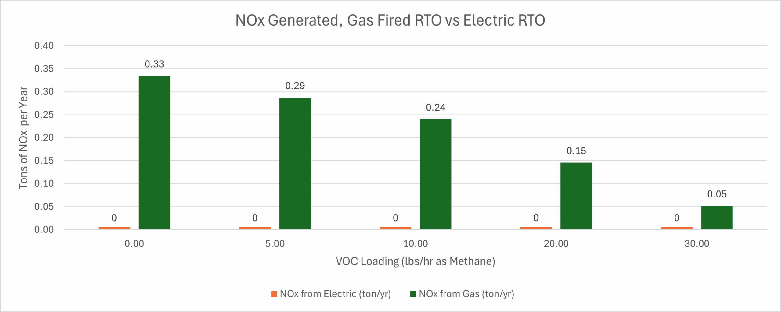 In addition to the formation of CO2, NOx is also produced due to the high temperature of the burner flame. Replacing a gas fired burner with an electric heater eliminates the CO2 and NOx that is generated from the heating source. CO2 will still be produced from the oxidation of the VOCs themselves in either a gas or electrically heated RTO.